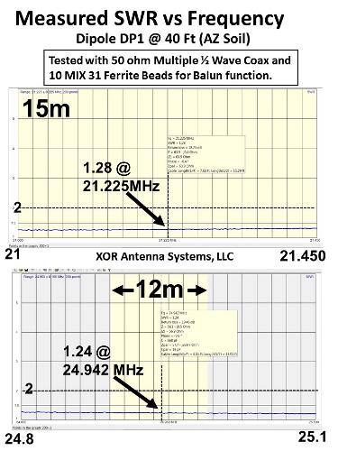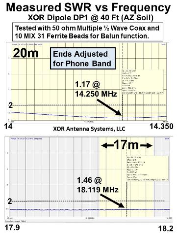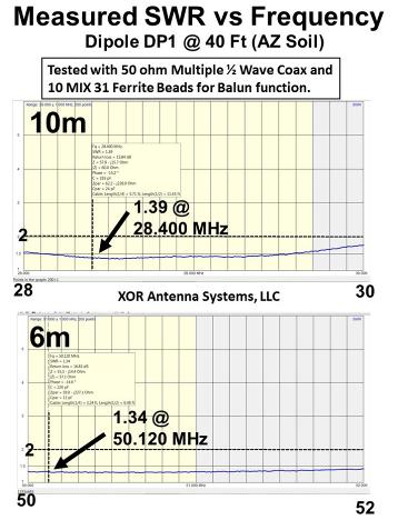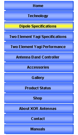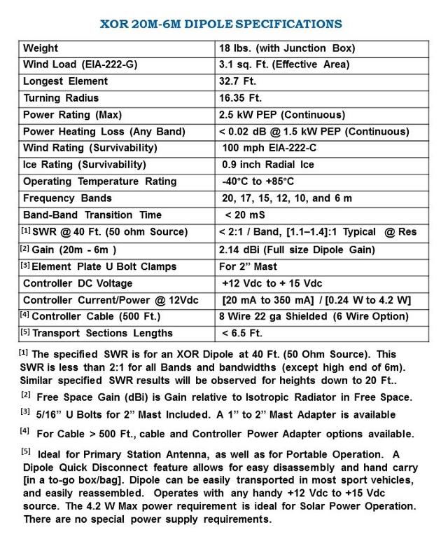 The design of XOR’s HF rotary dipole antenna is inherently robust, cost effective, and without the need for routine maintenance. This dipole antenna’s operating temperature range is from -40°C to +85°C, features a 2.5 kW PEP (continuous) input power rating and is mechanically designed for a wind survival rating of 100 mph. This lightweight (18 lbs.) dipole antenna is easy to install, easy to disassemble and easy to transport (6.5 ft sections) for portable operation. (See Dipole Specifications below). XOR’s Band Controller switches XOR’s antenna bands almost instantaneously, and can be powered from any common 12Vdc power supply [+12Vdc to +15Vdc, > 4W rating]. A +12Vdc low RF noise power adaptor is included for controller with this dipole antenna. XOR’s HF dipole antenna provides excellent SWR across all bands (20m through 6m). (See Measured SWR Data below). See also XOR’s Dipole Assembly Manual (Manual Tab) for more detailed dipole antenna information. Some typical applications of this 6-band dipole antenna include: base station (including stealth), emergency, RV, sport transport and 6-band side monitoring of a multi-band Yagi antenna. XOR’s dipole antenna is now available at XOR’s SHOP store. (SHOP menu tab), or go to: https://www.xorantennas.com/shop/ |